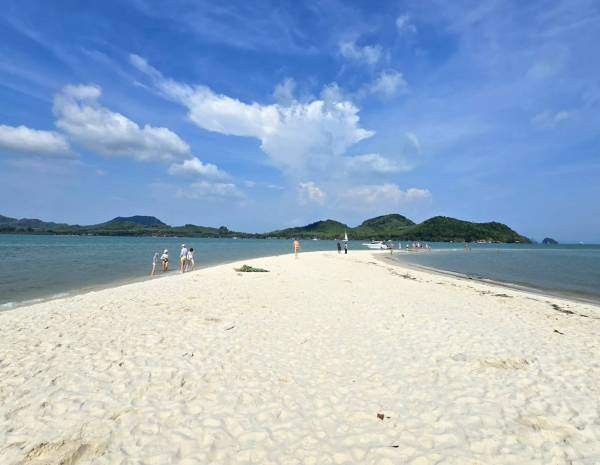 แหลมหาดเป็นปลายแหลมเล็ก ๆ ที่ธรรมชาติรังสรรค์ไว้ แต่ความสวยแบบนี้ไม่ได้เห็นกันตลอด ต้องเช็กเวลาน้ำขึ้นน้ำลงให้ดี เพราะช่วงน้ำลดเท่านั้นที่สันทรายจะค่อย ๆ โผล่ทอดตัวยาวออกไปกลางทะเลออกไปประมาณ 1 กิโลเมตร ฃเหมือนมีถนนสีขาวตัดผ่านผืนน้ำสีฟ้าใส ทรายที่นี่ขาวละเอียด นุ่มเท้า เดินปนร้อนนิดๆ จากไอแดด นักท่องเที่ยวต่างชาติหลายคนนอนอาบแดดกันสบาย ๆ บางคนลงเล่นน้ำ บางคนก็เดินเล่นถ่ายรูปบนแนวสันทราย บรรยากาศไม่ได้วุ่นวาย แต่เป็นความคึกคักที่เงียบสงบ ราวกับทุกคนกำลังปล่อยกายปล่อยใจไปกับความสวยของที่นี่