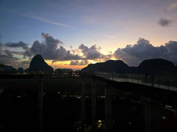 เราเลือกมาถึงตั้งแต่ฟ้ายังไม่สว่างเต็มที่ เดินขึ้นสู่บียอนด์ สกายวอล์ก สะพานกระจกยาว 180 เมตร สูงกว่า 80 เมตรเหนือระดับน้ำทะเล ก้าวแรกอาจมีใจเต้นเล็กน้อย สำหรับใครที่กลัวความสูง แต่เมื่อเงยหน้ามองออกไป ภาพตรงหน้าก็ทำให้ลืมความหวาดเสียว วิวพาโนรามา 360 องศาเผยให้เห็นแนวป่าชายเลนผืนใหญ่ ทะเลอันดามัน และหมู่เกาะหินปูนที่ตั้งตระหง่านกลางผืนน้ำ เรียงตัวสลับซ้อนเป็นชั้น ๆ สีเขียวของพืชพรรณตัดกับผืนน้ำสีฟ้าอ่อนในแสงเช้า งดงามจนต้องหยุดมองอยู่นาน