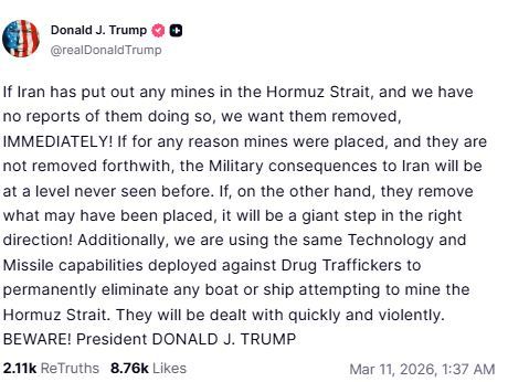 ट्रंप ने अपने सोशल मीडिया प्लेटफॉर्म पर पोस्ट करते हुए कहा कि अभी तक अमेरिका के पास यह रिपोर्ट नहीं मि है कि ईरान ने होर्मुज में सुरंगें बिछाई हैं. लेकिन अगर ऐसा किया गया है तो उन्हें तुरंत हटाया जाना चाहिए ट्रंप ने कहा कि अगर ईरान सुरंगें हटाता है तो यह सही दिशा में बड़ा कदम होगा.
