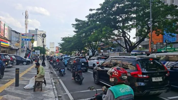 Kendaraan roda dua dan bentor tampak memadati jalan, sementara petugas berjaga mengatur arus.