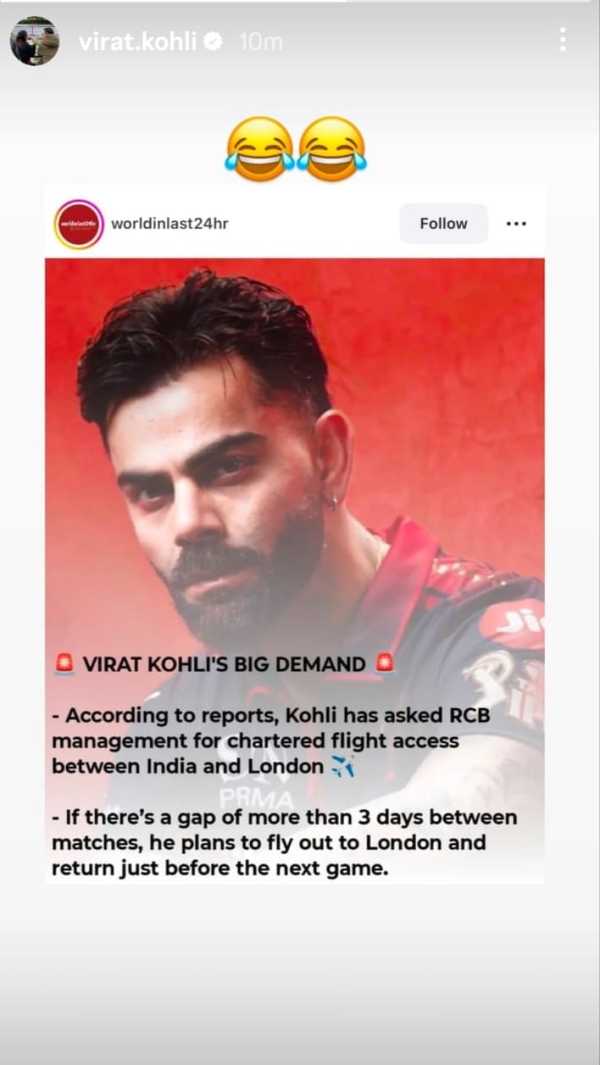विराट कोहली ने किया अफवाह का खंडनविराट कोहली ने खुद को लेकर सोशल मीडिया पर छाई अब उसी खबर का खंडन किया है. उन्होंने उस रिपोर्ट को अपनी इंस्टा स्टोरी में शेयर करते हुए उस पर हंसने वाली दो इमोजी लगाई है. विराट के इस कदम से साफ है कि उन्होंने भी उस खबर को बकवास बताया है और उसका मजाक उड़ाया है.