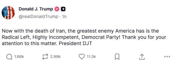 In his post on Truth Social, Trump wrote that with the “death of Iran”, the greatest threat facing America would be domestic political opponents, referring to the Democratic Party as the “Radical Left” and calling it highly incompetent. The comment appeared to link the ongoing military confrontation with Iran to his criticism of rivals at home.