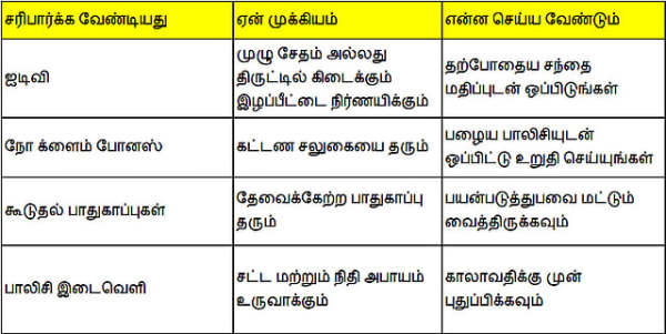 கார் காப்பீடு புதுப்பிப்பு சரிபார்ப்பு பட்டியல்புதுப்பிப்பு நேரத்தில் கவனிக்க வேண்டிய முக்கிய அம்சங்களை கீழே உள்ள அட்டவணை எளிதாக விளக்குகிறது.