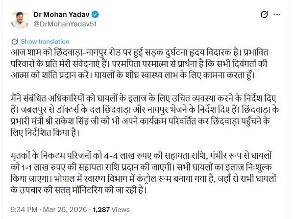 मैंने संबंधित अधिकारियों को घायलों के इलाज के लिए उचित व्यवस्था करने के निर्देश दिए हैं। जबलपुर से डॉक्टर्स के दल छिंदवाड़ा और नागपुर भेजने के निर्देश दिए हैं। छिंदवाड़ा के प्रभारी मंत्री राकेशसिंह को भी अपने कार्यक्रम परिवर्तित कर छिंदवाड़ा पहुंचने के लिए निर्देशित किया है।