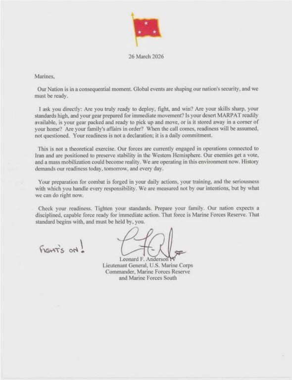 US Marine reservists have received a letter urging them to be prepared for potential deployment linked to Iran. The notice, sent by Lieutenant General Leonard F. Anderson IV, commander of Marine Forces Reserve (MARFORRES), warned Marines to check their gear, readiness and personal affairs in case mobilisation orders are issued.