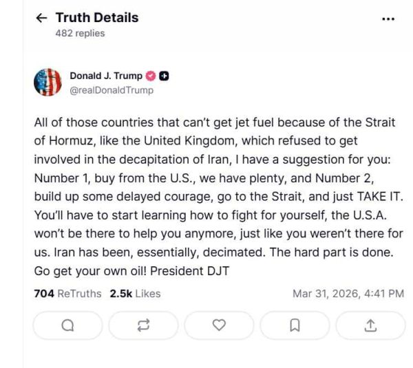 In a post, Trump said nations unable to access jet fuel should either buy from the United States or “go to the Strait and just take it”. He also criticised countries such as the United Kingdom for not supporting recent US-Israel military action involving Iran.