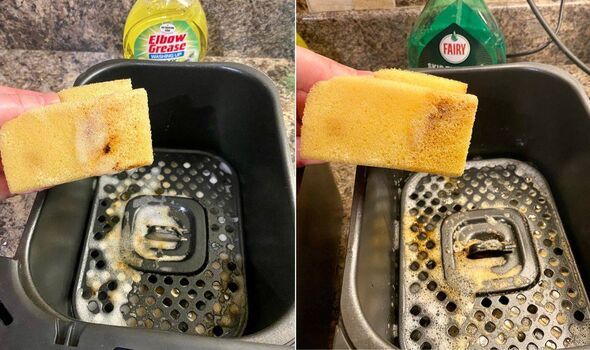 I then removed the air fryer trays and rinsed the baskets under the tap. The Elbow Grease side showed no remaining stains; however, a few stubborn patches of grease lingered on the Fairy Liquid side, though nothing that required any vigorous scrubbing.