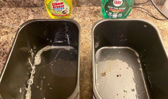 Remarkably, on the Elbow Grease side, all the grease was wiped away the first time with a sponge, whereas on the Fairy Liquid side, a little additional scrubbing was needed in the centre of the tray.