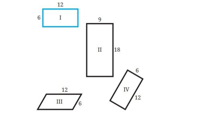 Persegi panjang I dan persegi panjang IV memiliki panjang sisi sisi yang sama dan dengan urutan yang sama, yaitu 6, 12, 6, dan 12. Selain itu, besar semua sudut dalamnya pun sama.