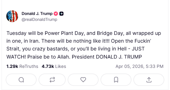 अमेरिकी राष्ट्रपति डोनाल्ड ने ईरान को एक बार फिर सख्त चेतावनी दी है. उन्होंने कहा है कि अगर ईरान होर्मुज स्ट्रेट नहीं खोलता, तो मंगलवार से उसके पावर प्लांट और पुलों पर हमले होंगे. ट्रंप ने इस दिन को पावर प्लांट डे और ब्रिज डे नाम दिया है. ट्रंप ने अपने सोशल मीडिया प्लेटफॉर्म ट्रूथ सोशल पर लिखा कि अगर ईरान ने रास्ता नहीं खोला, तो उसे नरक जैसे हालात का सामना करना पड़ेगा. उन्होंने बहुत कड़ी भाषा में कहा कि स्ट्रेट खोलो, नहीं तो अंजाम भुगतने के लिए तैयार रहो. ट्रंप ने पोस्ट में गालियों का भी इस्तेमाल किया.