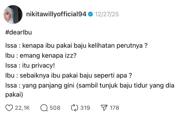 “Issa: kenapa ibu pakai baju kelihatan perutnya?” tulis Nikita dalam unggahan Threadsnya, (27/12/2025).