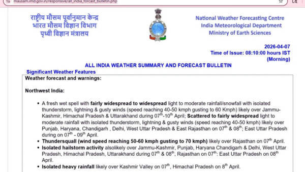 In particular, very intense weather conditions are predicted over Rajasthan, where squally thunderstorms along with strong winds at 50 to 60 kmph speed, with gusts up to 70 kmph, may occur on April 7. On the other hand, isolated heavy rains may be witnessed over the Kashmir valley on April 7 and over Himachal Pradesh on April 8.