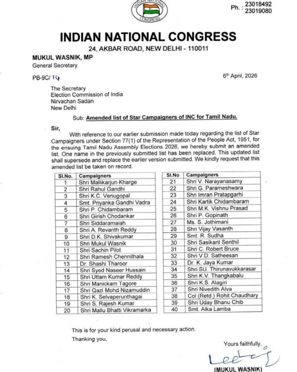Hyderabad: Telangana Chief Minister Revanth Reddy is among the star campaigners appointed by the All India Congress Committee (AICC) for the upcoming Tamil Nadu elections.