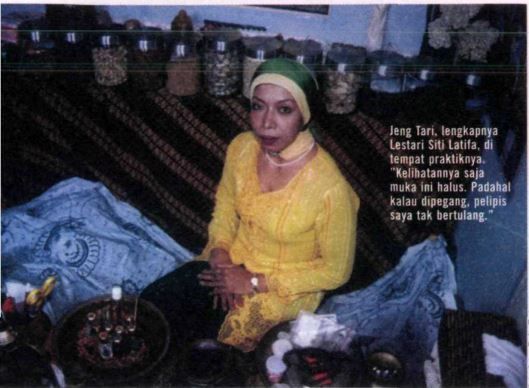 Di tempat itu pasien berdatangan dengan aneka macam keluhan. Tari, yang menggunakan nama Jeng Tari sebagai nama dagang, membantu lewat pelbagai jalan. Baik "laku", doa, maupun ramuan herbal yang bahannya berkarung-karung dia simpan di lantai atas tempat praktiknya.